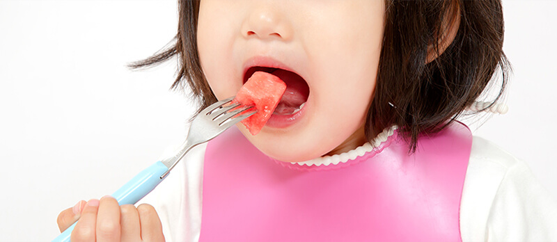 子どもが美しい歯並びと正しい噛み合わせになるためには、特に正しい食べ方を身につける「食育」が必要です。子どもによく見られる間違った食べ方の例を以下にご紹介します。